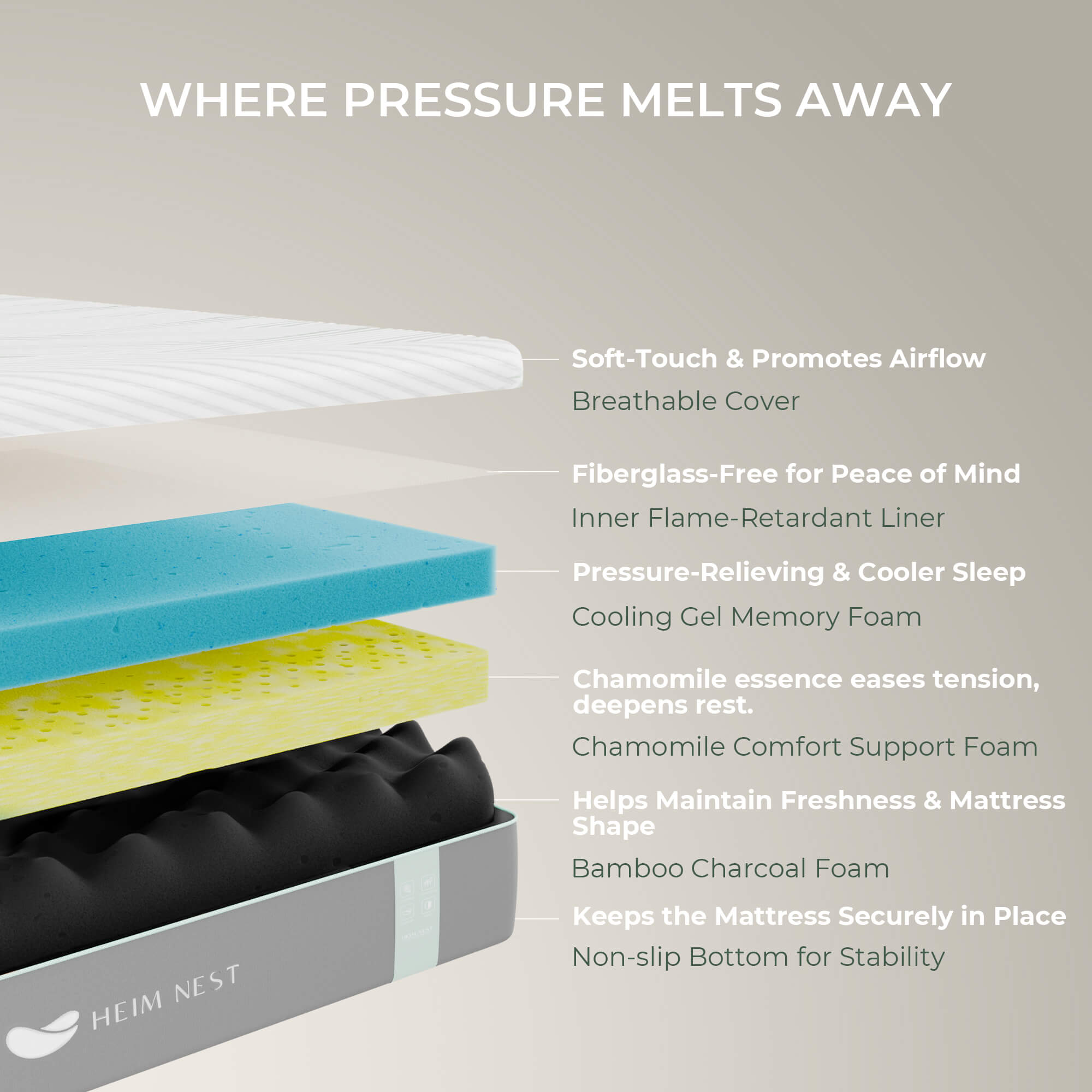 The Heimnest HN-MF02 Chamomile Memory Foam Mattress is revolutionary for those with sleep disorders, hot sleepers, insomnia, college students, and people with high blood pressure. Created to offer unmatched comfort and scent throughout the night, this mattress is essential for those in search of a calming and soothing sleep.